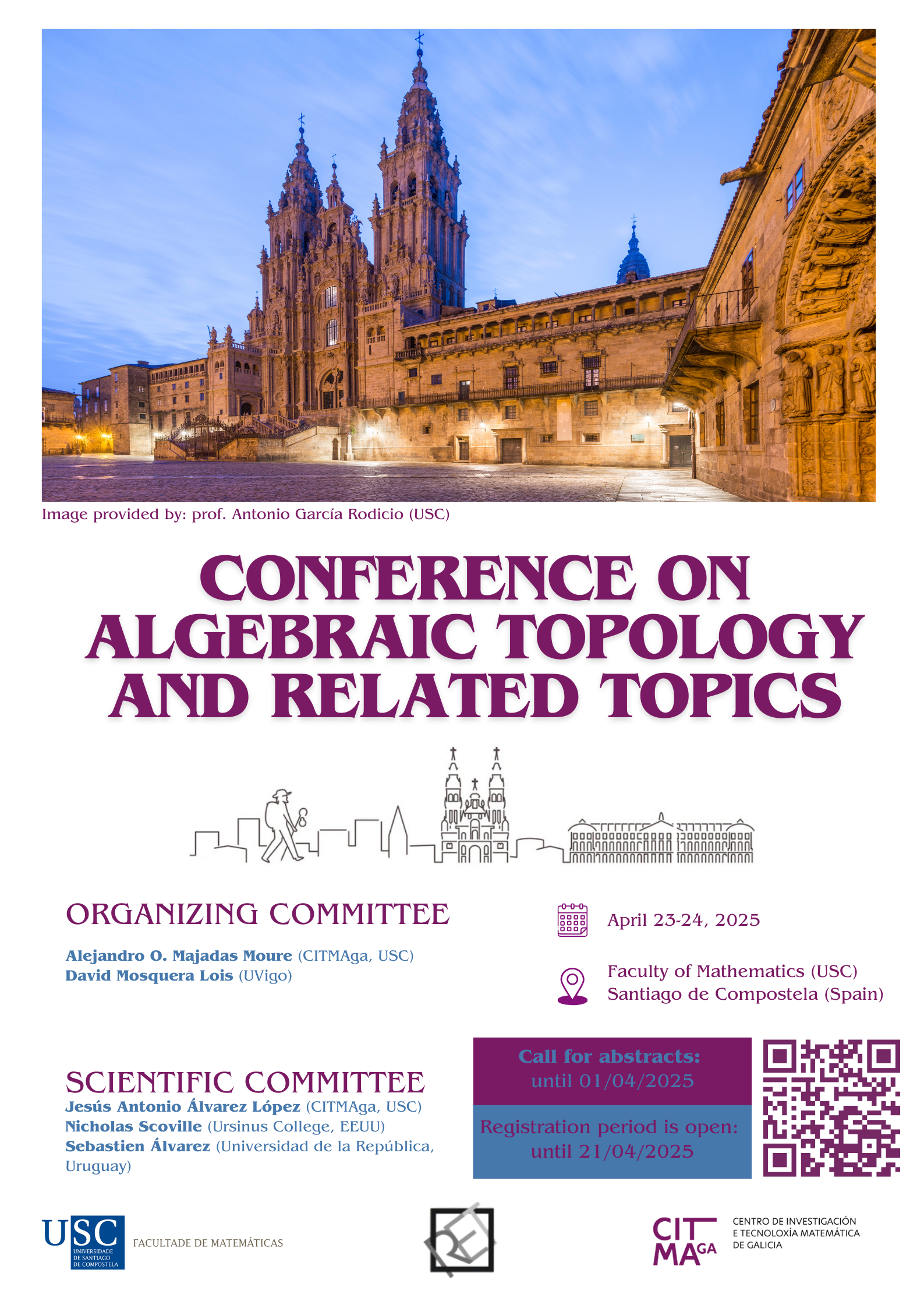 - Submission of abstracts: until 01/04/2025. Send to david.mosquera.lois@uvigo.gal and alejandro.majadas@usc.es indicating in the subject “Abstracts | Conference on Algebraic Topology”.